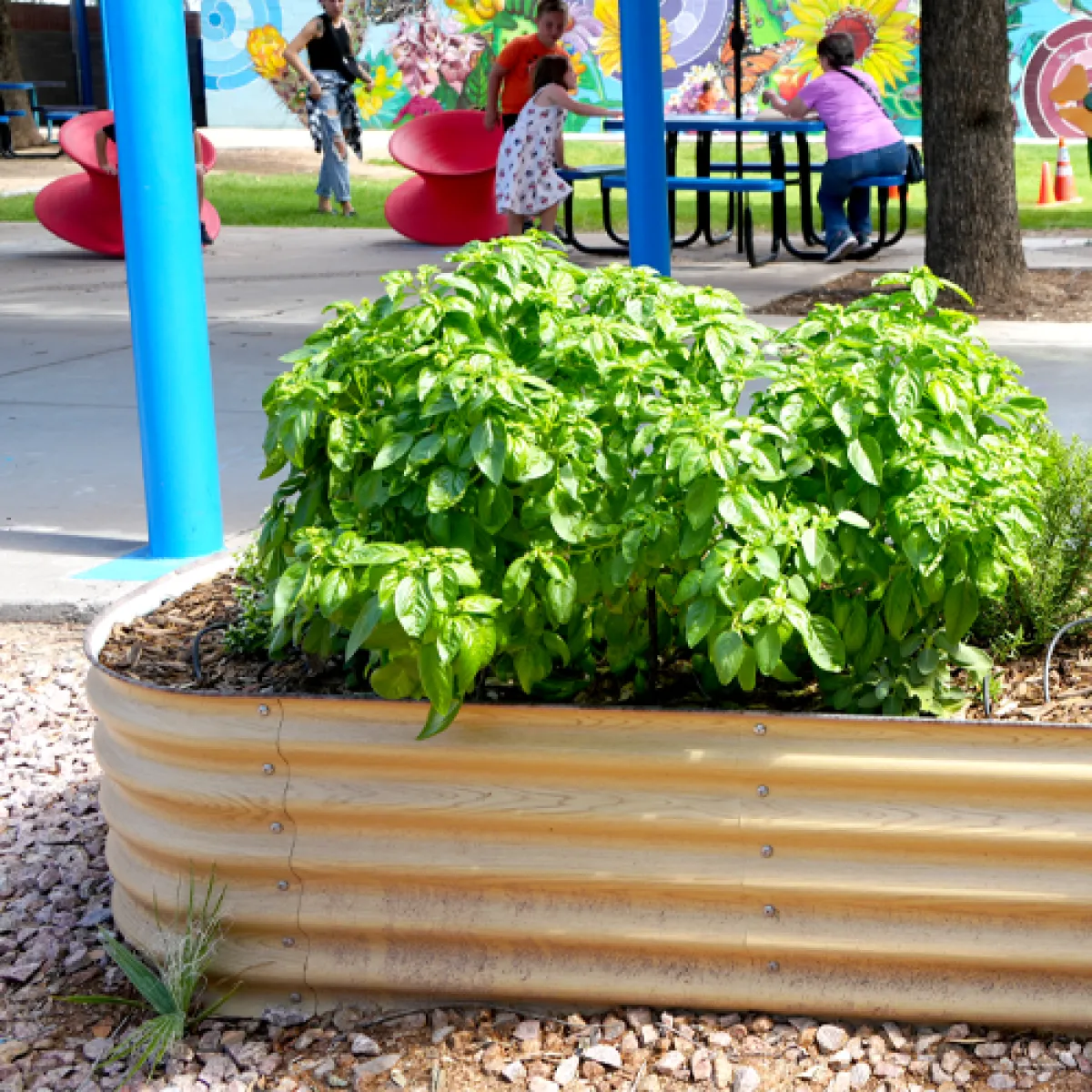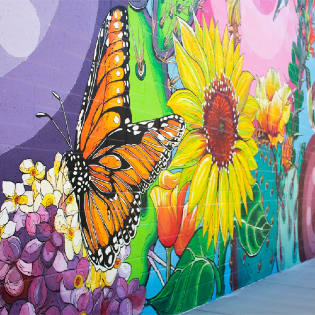 Large mural that features Arizona native pollinators and plants and includes sensory accents like touch and smell.