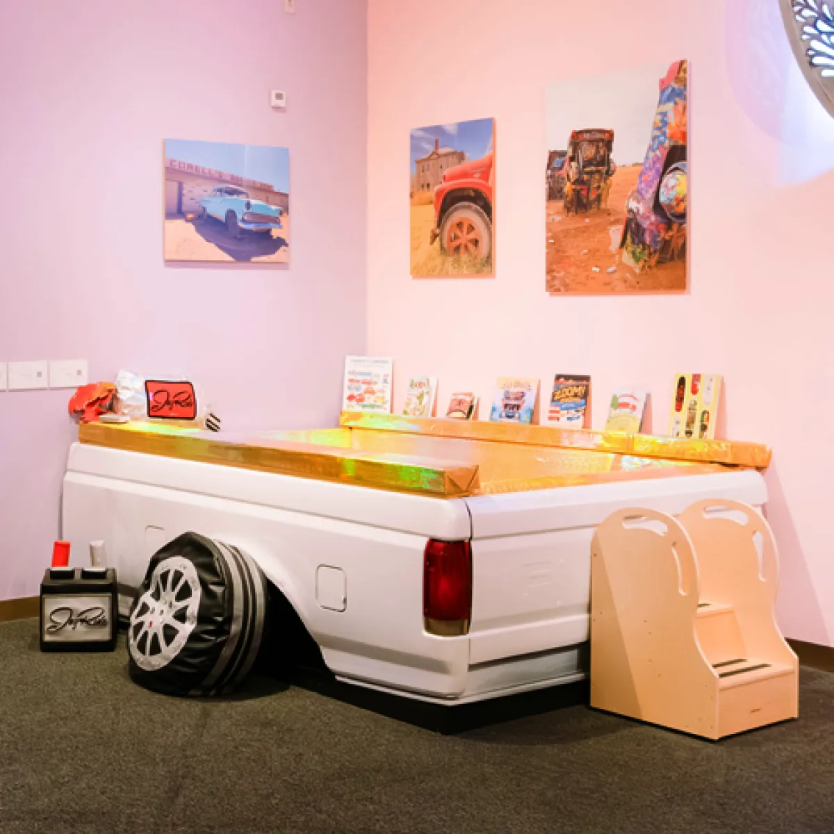 Take a break in our cozy reading nook in an ingeniously built 1980s Ford truck bed.